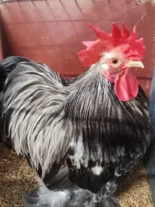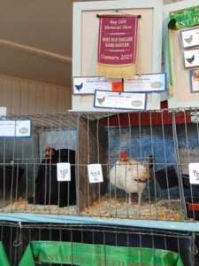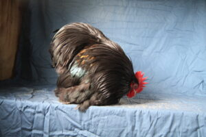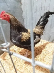 Old English Game Bantam: Male; “black, with brass colour on back, wing butts, hackles and hangers. No wing bay colour allowed, clear hackles and hangers allowed.”
