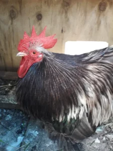 Old English Game Bantam: Male; “black, with brassy wing butts, wing bay, saddle hangers. Brassiness to be allowed in hackles and on back.”